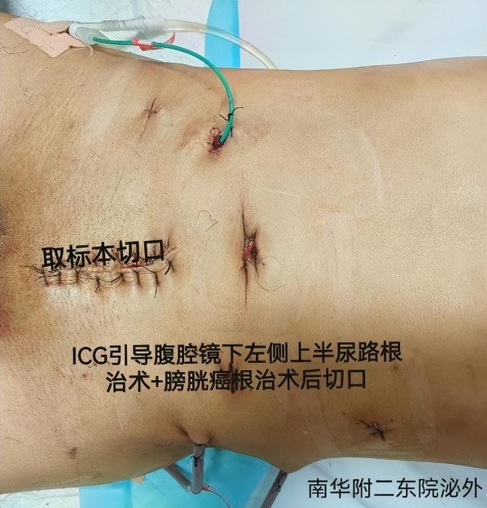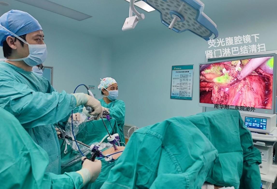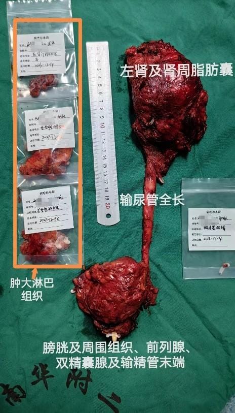 手术由该院泌尿外科副主任兼东院泌尿外科主任李志军博士主刀,在麻醉科、手术室的密切配合下,术中将ICG的荧光导航技术与4K高清腹腔镜技术“双剑合璧”。在大范围切除病变器官组织(左肾、肾周脂肪囊、左输尿管全长、膀胱、前列腺、双侧精囊腺、双输精管末端)的同时让腹膜后、双侧盆腔多发肿大淋巴结无处遁形,均被一一切除。手术顺利完成,术中出血不足200ml,术后患者恢复良好,无尿漏、淋巴漏、肠坏死、直肠损伤、腹腔感染等严重并发症,目前已康复出院。该项高难度微创术式代表了医院泌尿外科作为国家临床重点专科培育科室的最新技术成果,进一步巩固了泌尿外科在衡阳市的专科领头地位和省内领先水平,为我市及湘南地区大量肿瘤患者得到更优质高效的医疗服务带来福音。