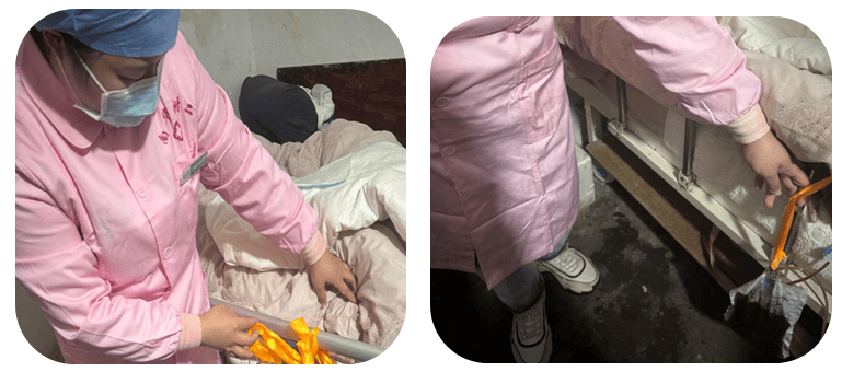进门后两人顾不上冻得通红的双手,立即投入工作。向家属详细询问了患者基本情况,专业而细致地为患者做完评估后,顺利为患者插上了导尿管,引流出了尿液,同时又仔细的向张阿姨交代了尿管留置期间的注意事项。护工阿姨如释重负,爷爷的脸上也露出了温暖的笑容。