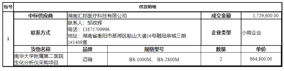 南华大学附属第二医院的南华大学附属第二医院生化分析仪采购项目公开招标采购项目于2025年02月13日结束,现将中标(成交)结果公告如下: