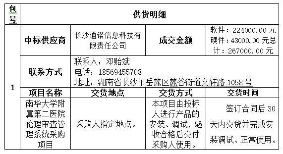 南华大学附属第二医院伦理审查管理系统采购项目于2024年11月18日结束,现将中标(成交)结果公告如下: