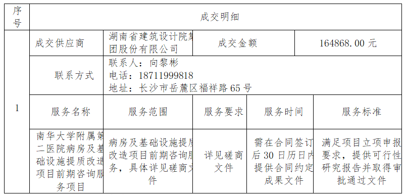 南华大学附属第二医院的病房及基础设施提质改造项目前期咨询服务项目于2025年9月16日结束,现将成交结果公告如下: