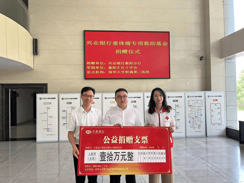 8月17日上午,南华大学附属第二医院与兴业银行衡阳分行在衡阳市红十字会举行“兴业银行垂体瘤专项救助基金”捐赠仪式。兴业银行衡阳分行向衡阳市红十字会连续5年每年捐赠10万元专门用于贫困垂体瘤患者的救治,南华大学附属第二医院作为定点机构提供全方位医疗支持。